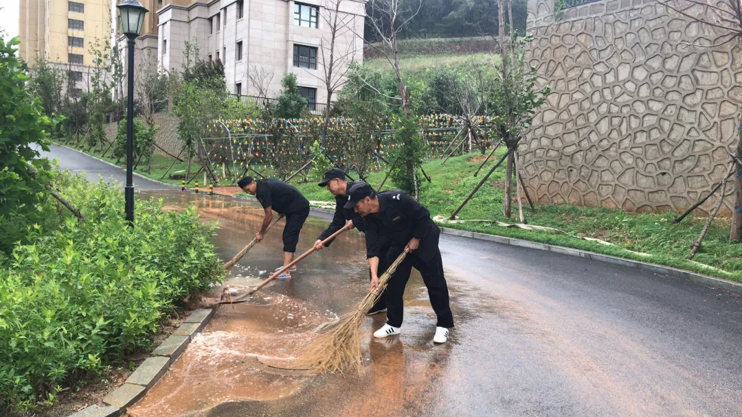 當(dāng)暴雨到來時,面對各種各樣的突發(fā)事件,依舊是他們奮戰(zhàn)在一線。清理積水,搭建簡易防水堤。干起活來顧不上別的,雨傘都扔到了一邊。“這么大的雨,我們苦點累點沒關(guān)系,關(guān)鍵是一定得保證咱們業(yè)主不受影響呀!”