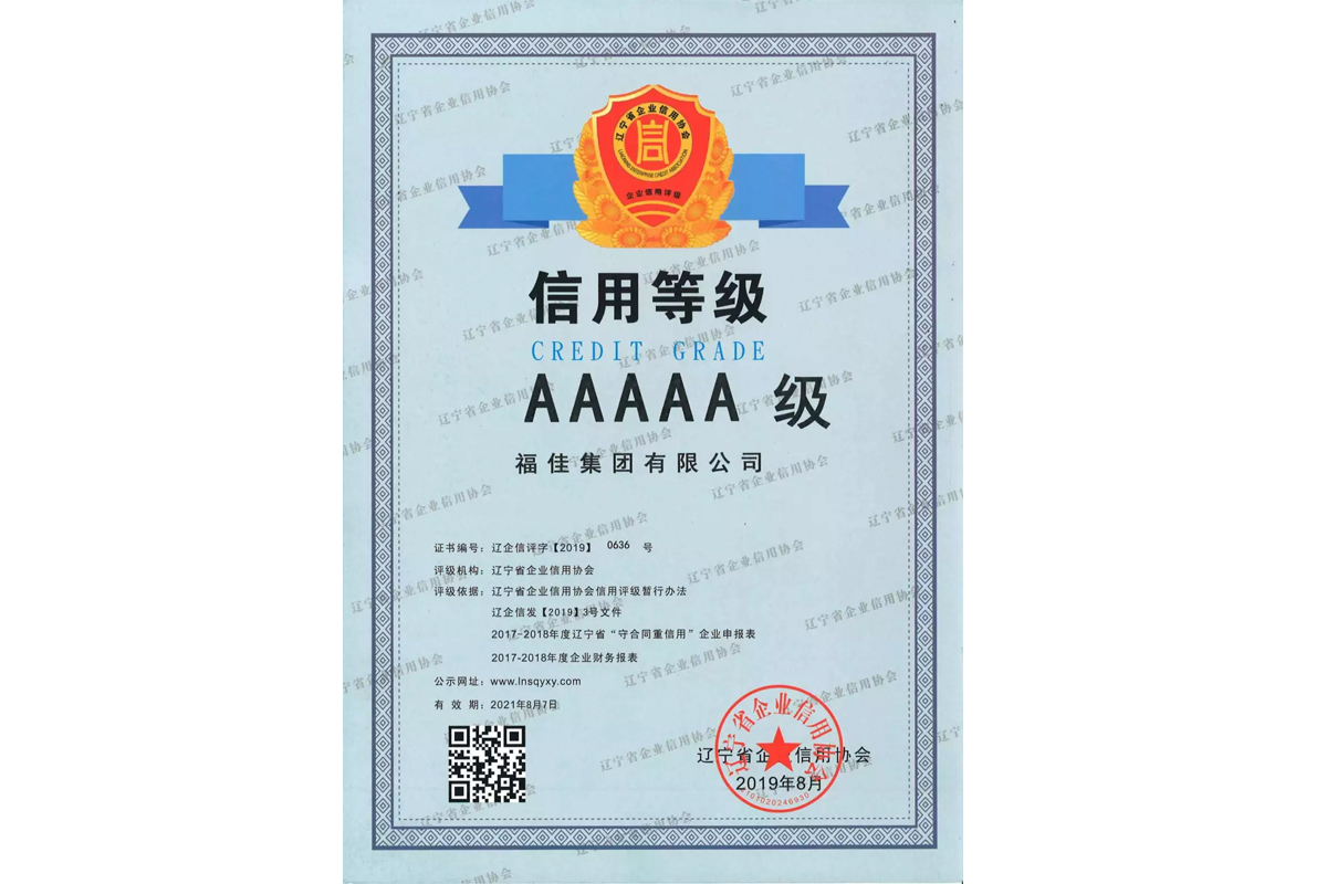 2019年12月12日,福佳集團有限公司收到由遼寧省企業信用協會頒發的“守合同重信用”企業公示證書,被認定為2017-2018年度遼寧省 “守合同重信用”企業。經遼寧省企業信用協會評定,福佳集團信用等級AAAAA級。這是對福佳集團長期秉持“誠信發展 服務社會”經營理念的最好詮釋。