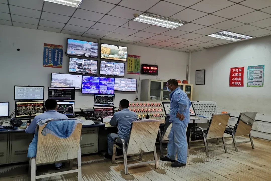 圖二:拍攝時間:2020年4月2日;地點:碼頭DCS中控室;圖中人物:左一:碼頭三班班長宮興夫;左二:碼頭三班內操王吉南;左三:碼頭三班內操王忠陽。正在討論班組一天緊張而又忙碌的生產工作。