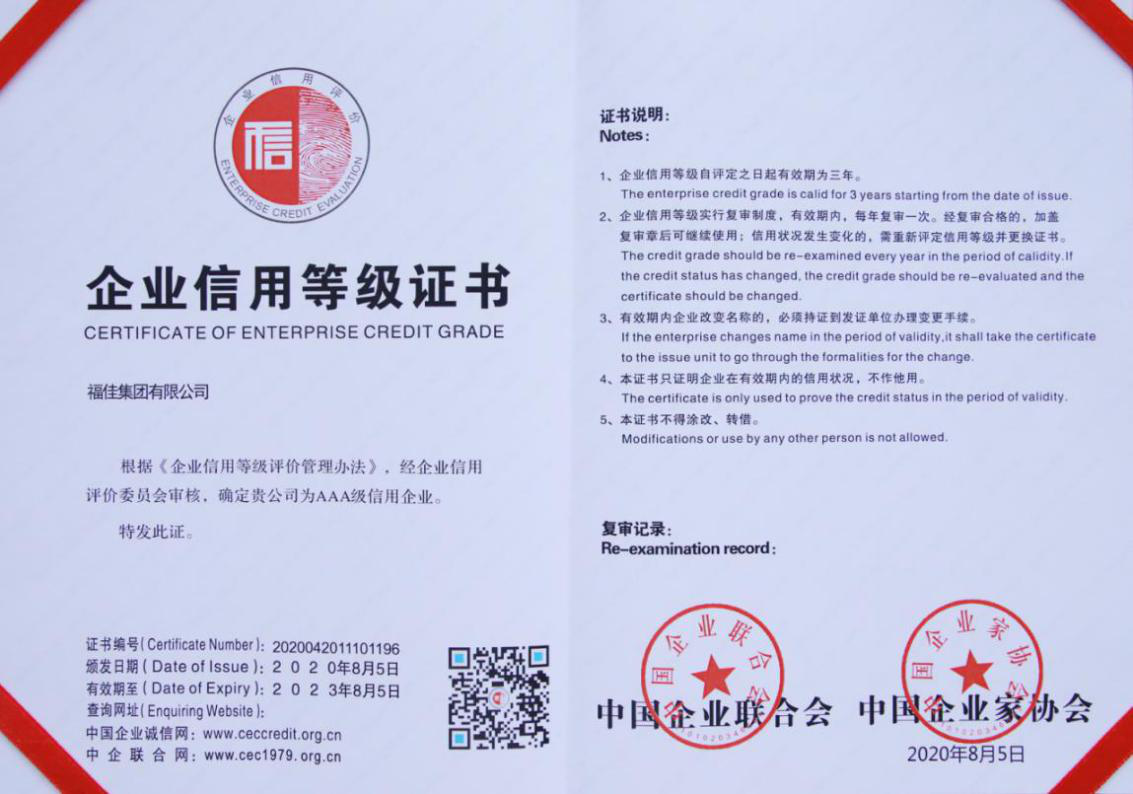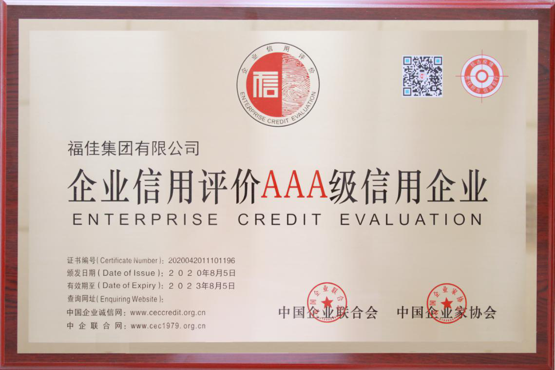 近日,中國企業聯合會、中國企業家協會聯合發布“2020年第一批信用企業名單”,福佳集團獲得AAA級企業信用等級證書。“AAA級信用等級”是信用等級的最高級別,這是對福佳集團長期秉持“誠信發展 服務社會”經營理念的最好嘉獎。