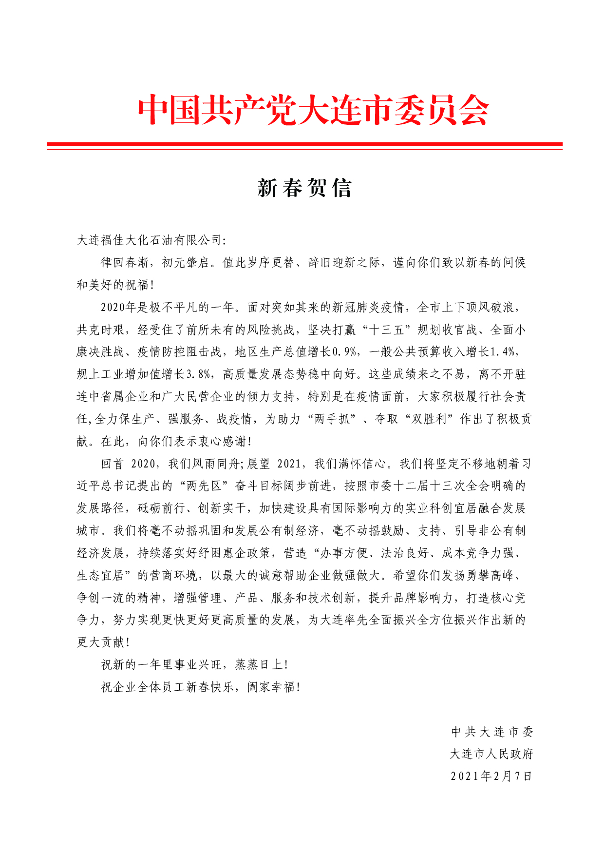中共大連市委 大連市人民政府新春賀信