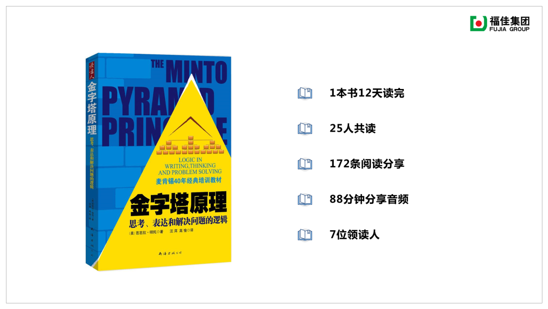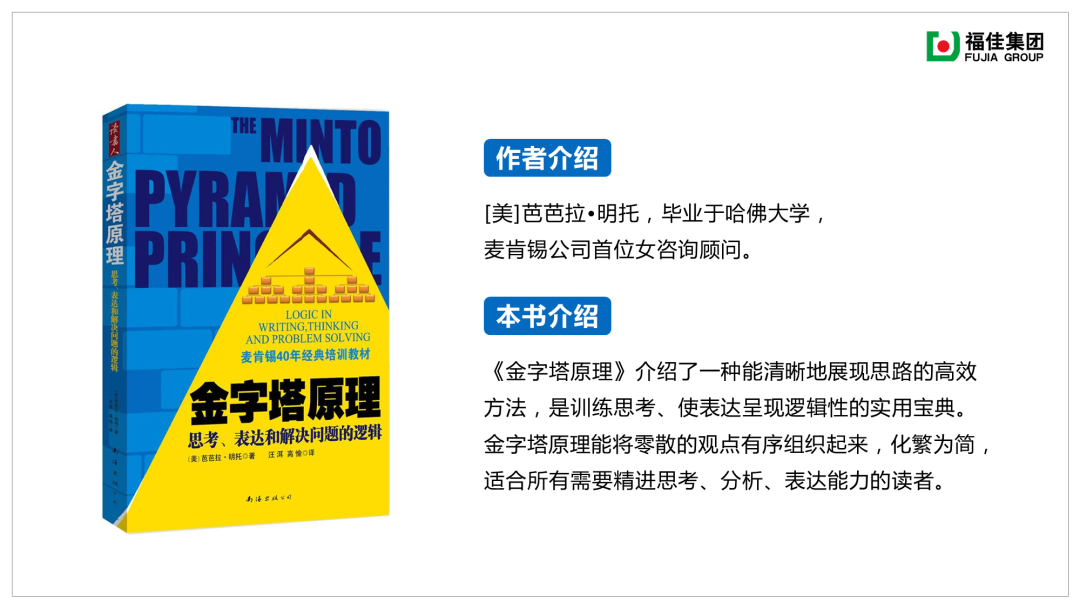 開卷有益·你我共讀,3月6日,福佳2020屆儲英讀書會開營。人力事業部培訓組選擇《金字塔原理》共讀,作為麥肯錫四十年經典培訓教材,書中介紹了金字塔結構的思維方式,這是一種層次分明、結構化的思考和溝通技術,可以幫助我們高效地思考和表達。