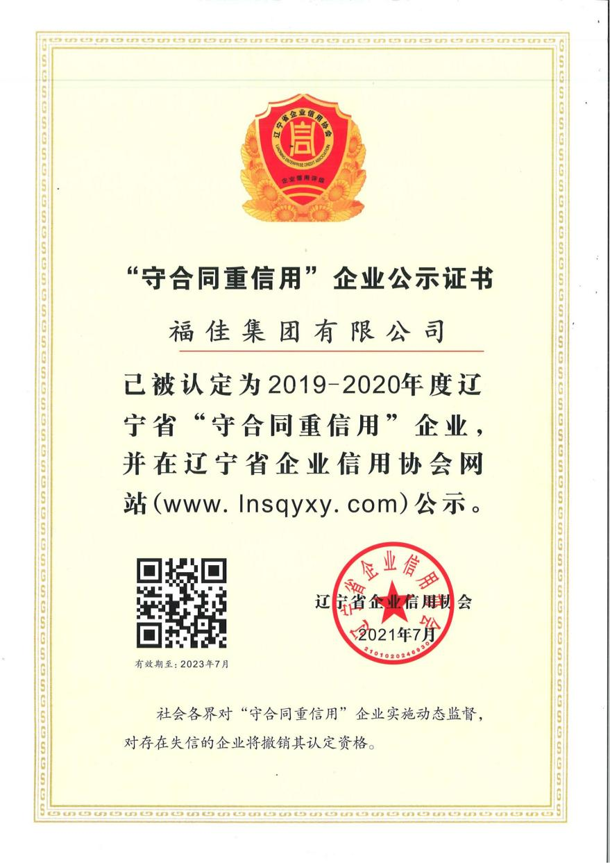 近日,由遼寧省企業(yè)信用協(xié)會評選的2019-2020年度遼寧省“守合同重信用”企業(yè)結果出爐,福佳集團再次被認定為遼寧省 “守合同重信用”企業(yè)。這是對福佳集團長期秉持“誠信發(fā)展 服務社會”經營理念的最好詮釋。