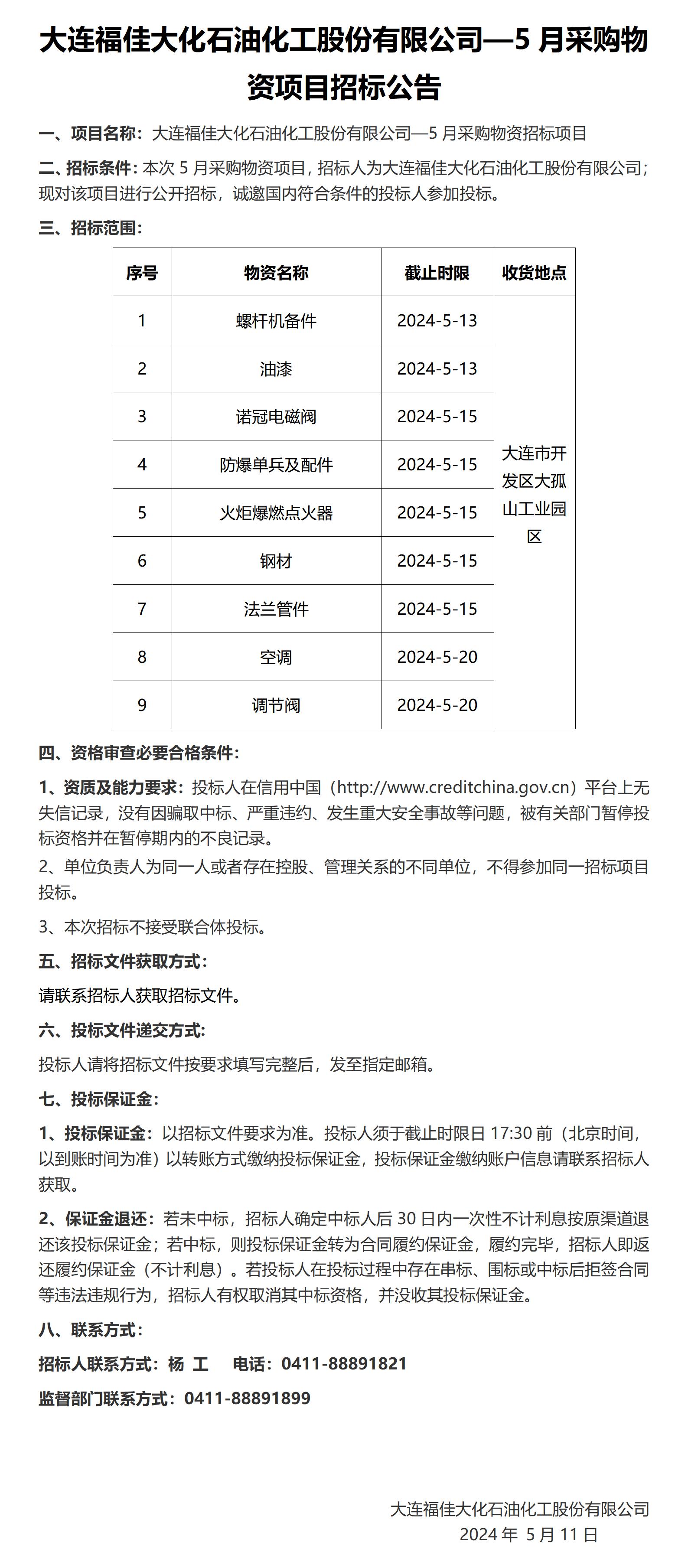 大連福佳大化石油化工股份有限公司—5月采購(gòu)物資項(xiàng)目招標(biāo)公告