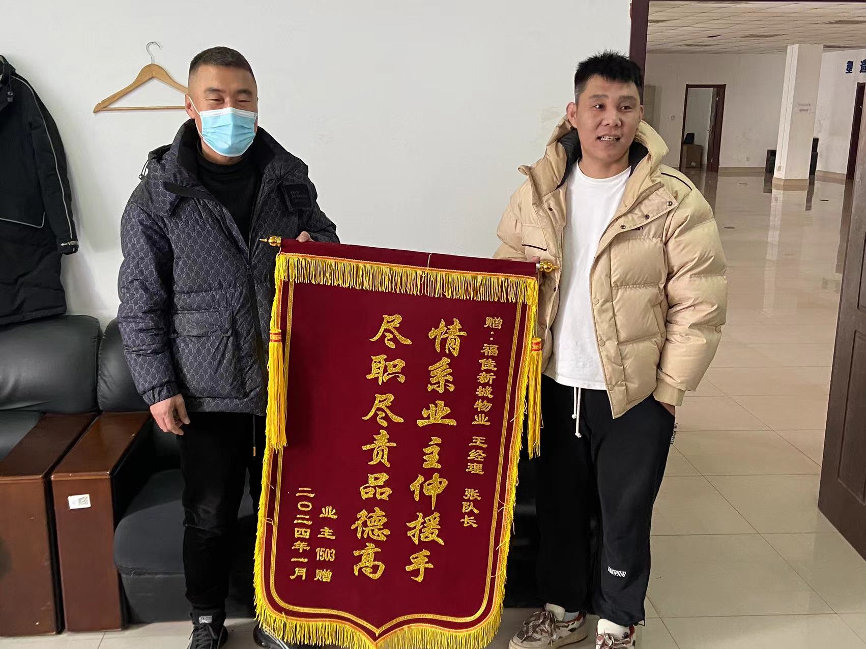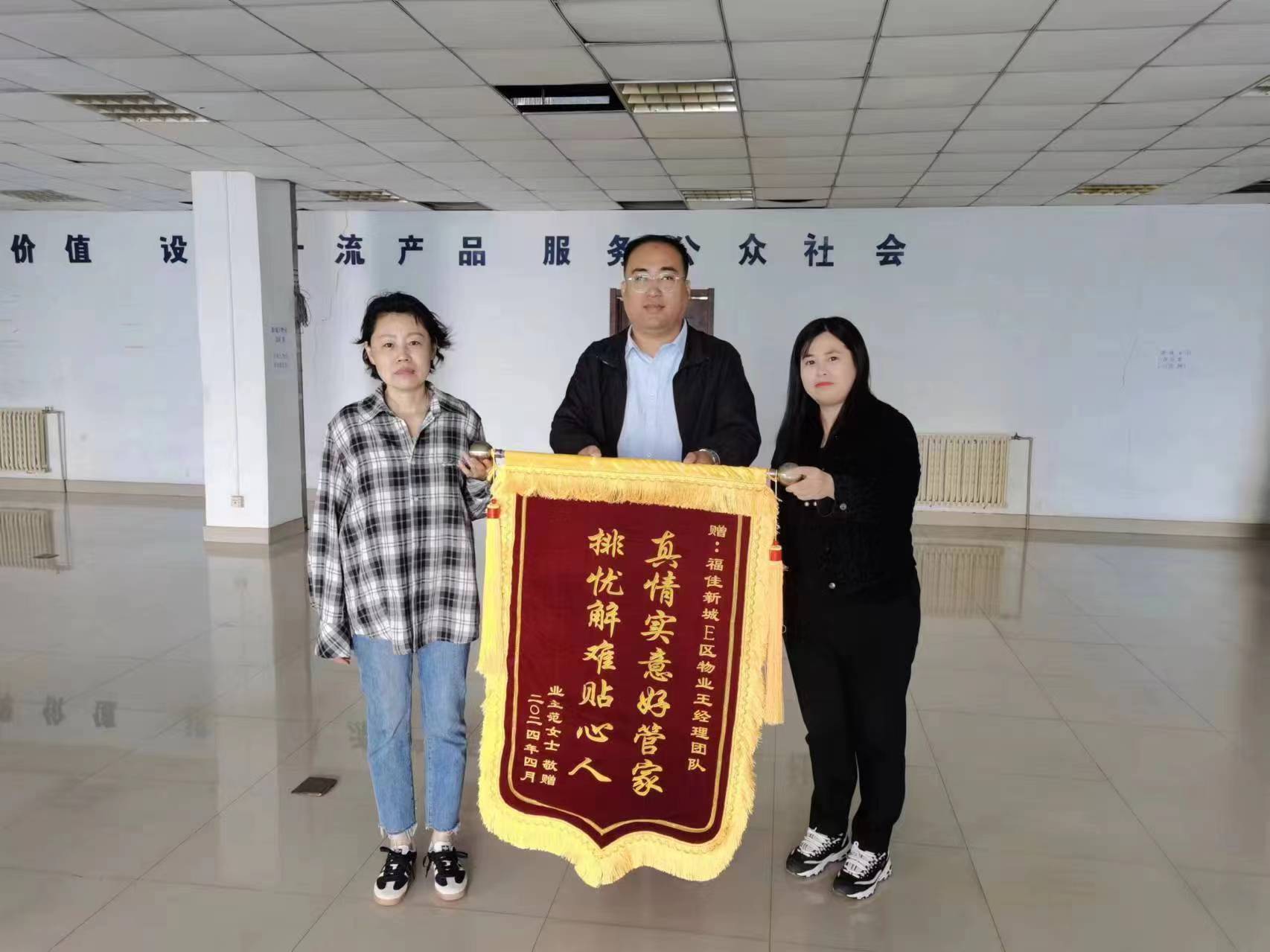 業(yè)戶為表達對郝玉國及物業(yè)全體工作人員的感謝,特贈送一面“情系業(yè)主辦實事,熱情服務暖人心”的錦旗,并紛紛在業(yè)主群內為他們點贊。