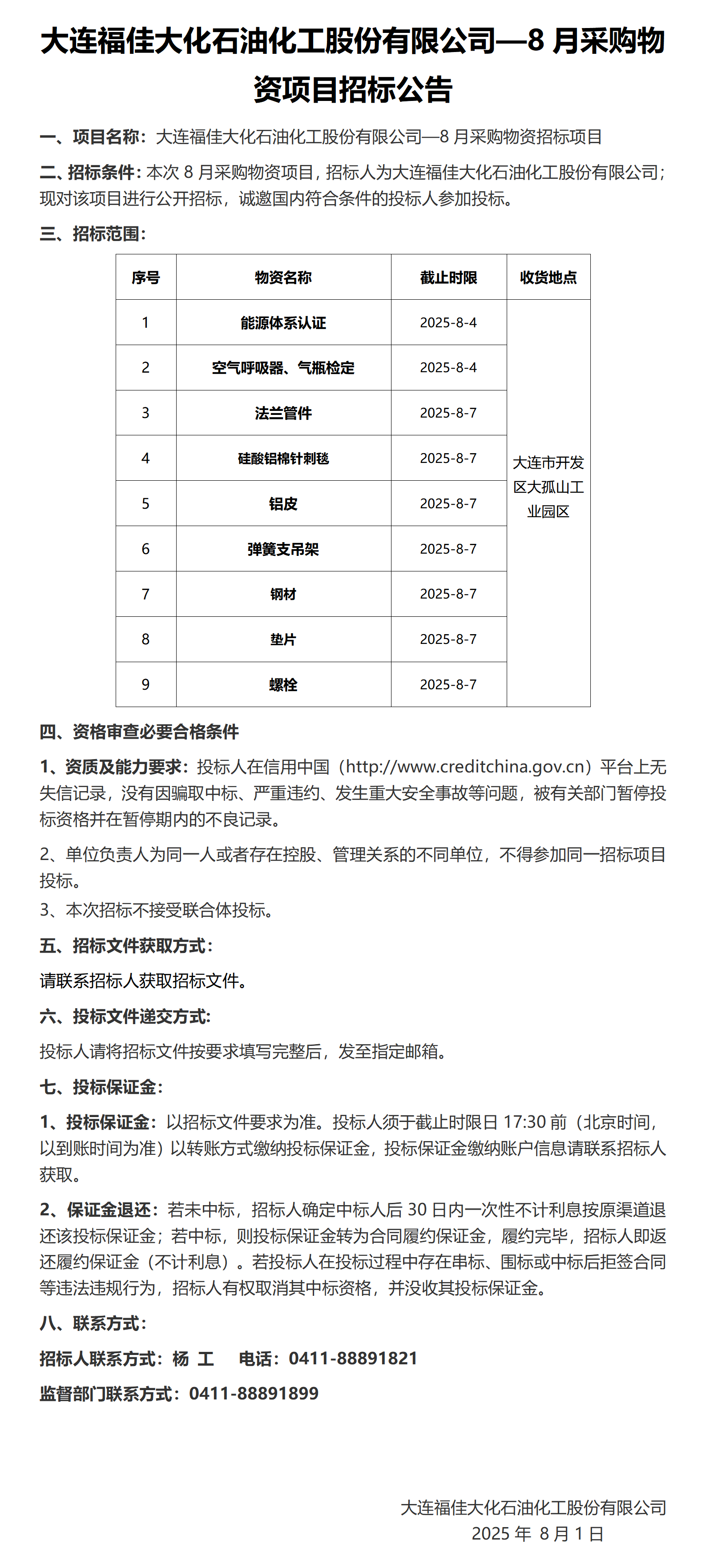 大連福佳大化石油化工股份有限公司—8月采購物資項目招標公告