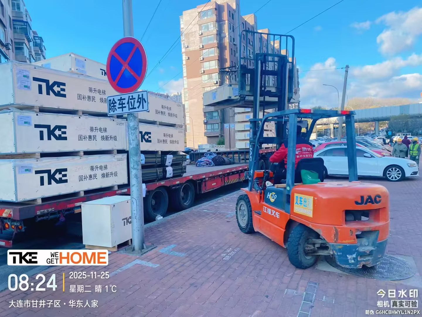 前期準備階段:新電梯設備已安全入場,施工團隊與物資全部就位。