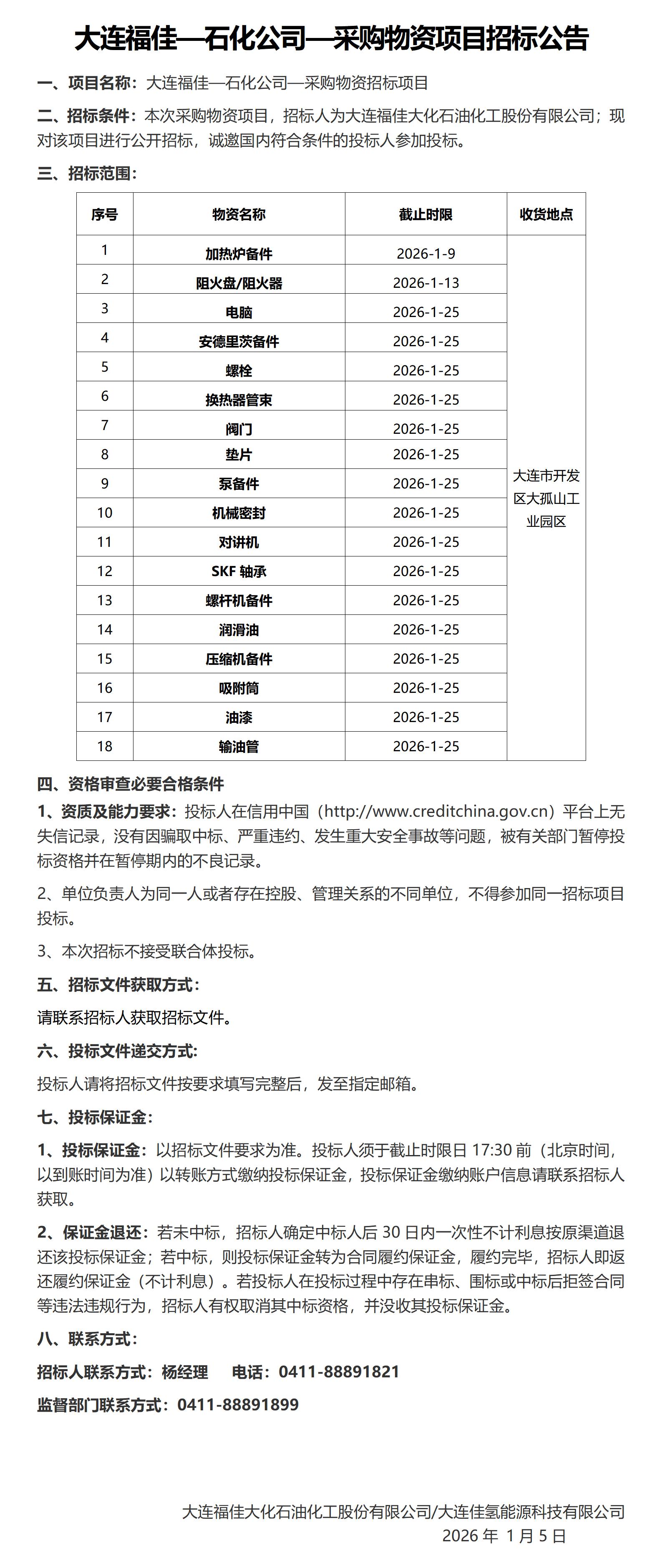 大連福佳大化石油化工股份有限公司—1月采購物資項目招標公告