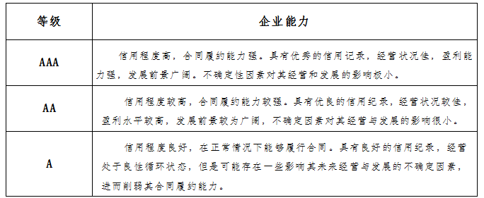 信用評級是企業綜合競爭力的證明。信用狀況是衡量企業履約能力、投標信譽的重要因素,通過信用評級可為企業綜合競爭力提供最有力的證明。