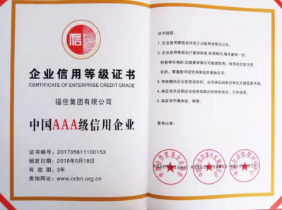5月19日,由中國合作貿易企業協會、中國企業改革與發展研究會主辦,由國信聯合(北京)認證中心承辦的“2018中國企業信用發展論壇暨第九屆誠信公益盛典”在京隆重召開。福佳集團榮獲2017年度中國AAA級信用企業,這是對福佳集團長期秉持“誠信發展 服務社會”經營理念的最好詮釋。